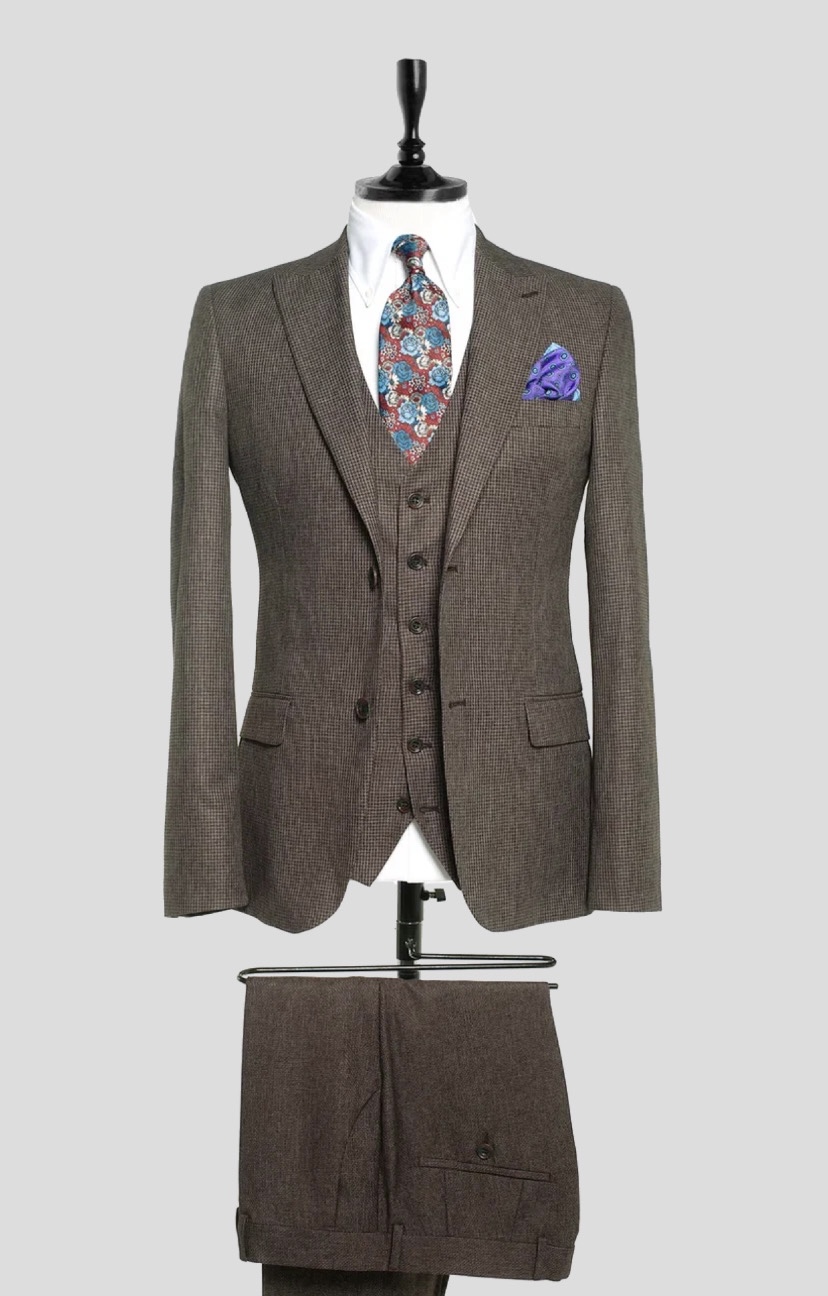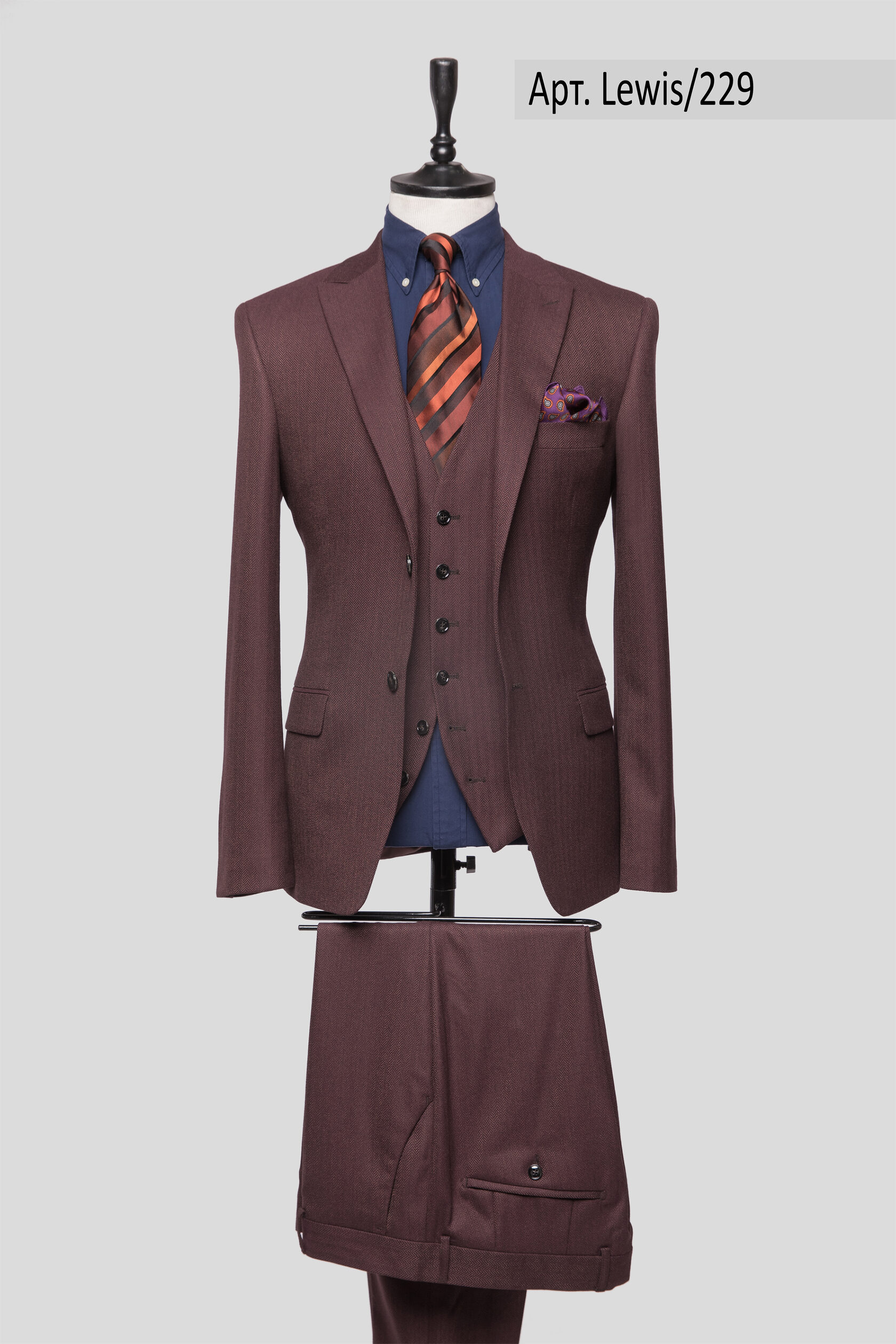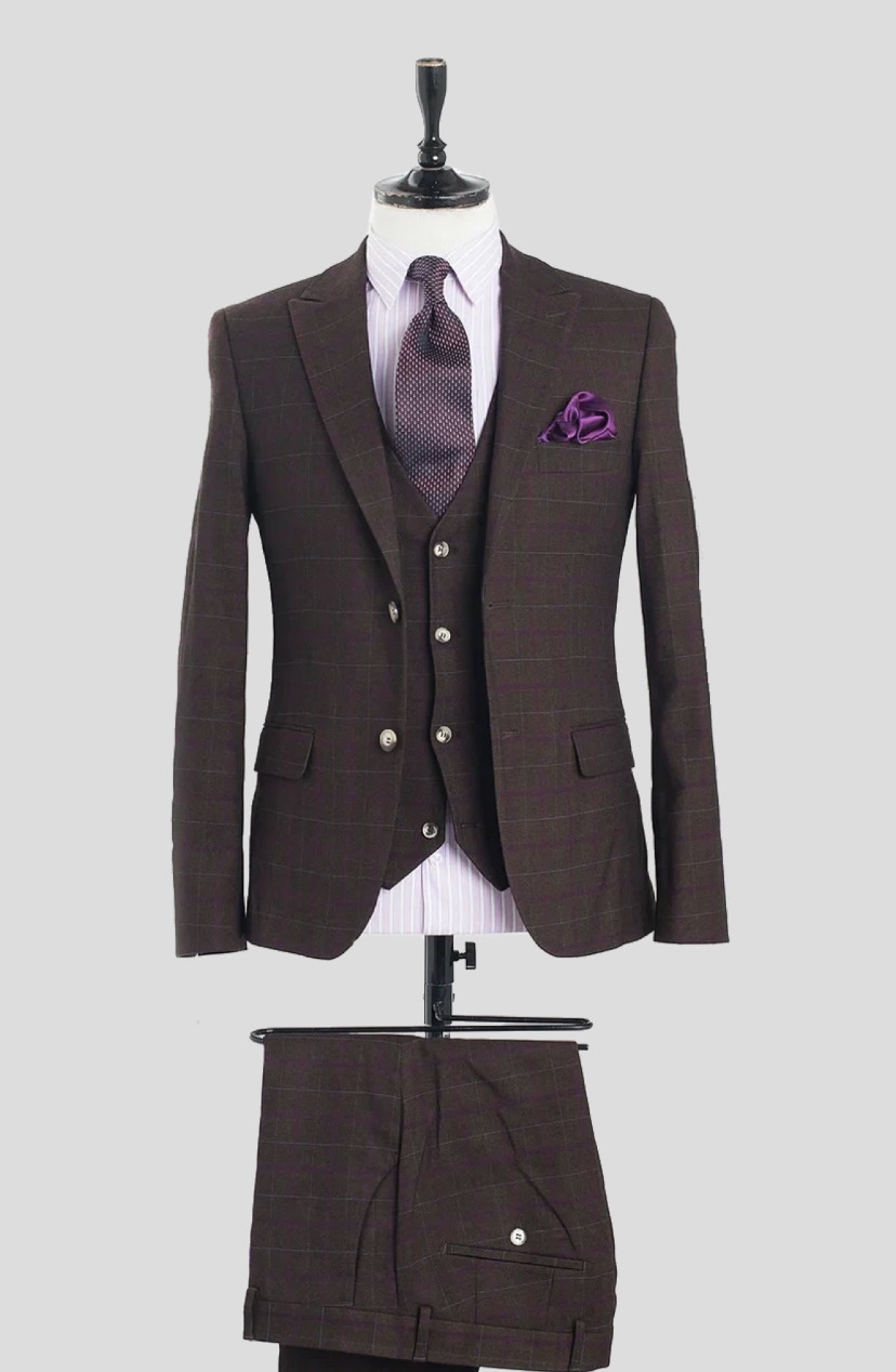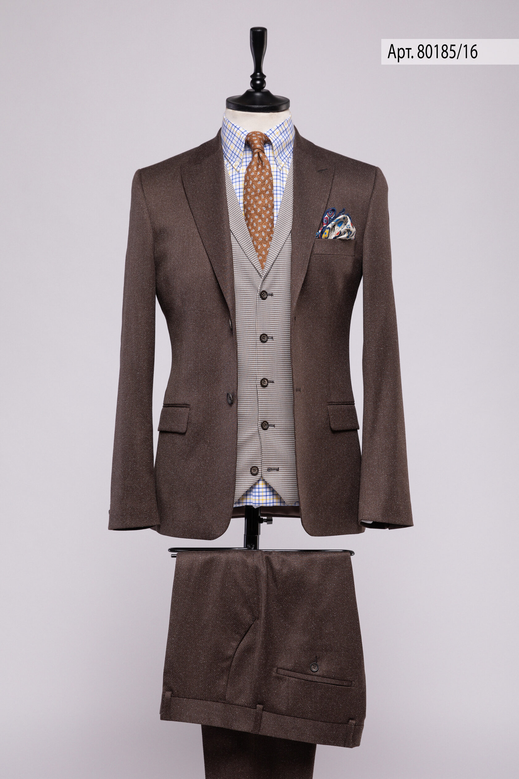Мужской костюм тройка коричневого цвета в бордовую клетку.