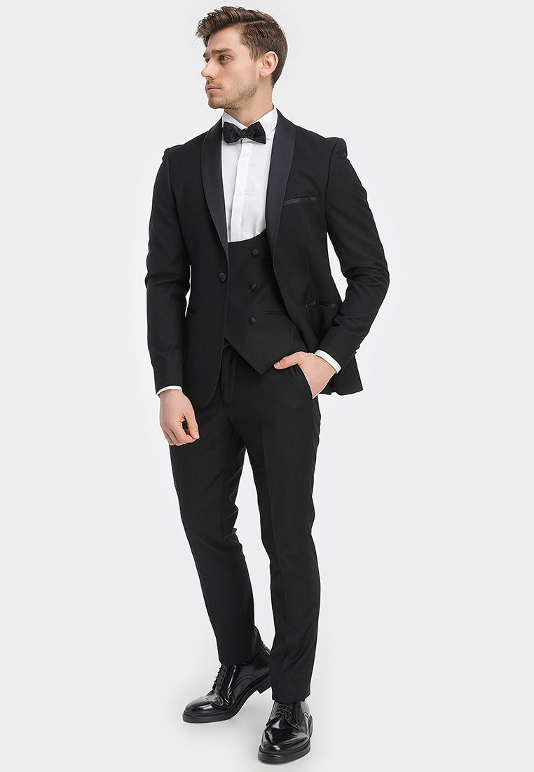 Мужской костюм тройка имеет широкий итальянский лацкан в сочетании с классической однорядной жилеткой.