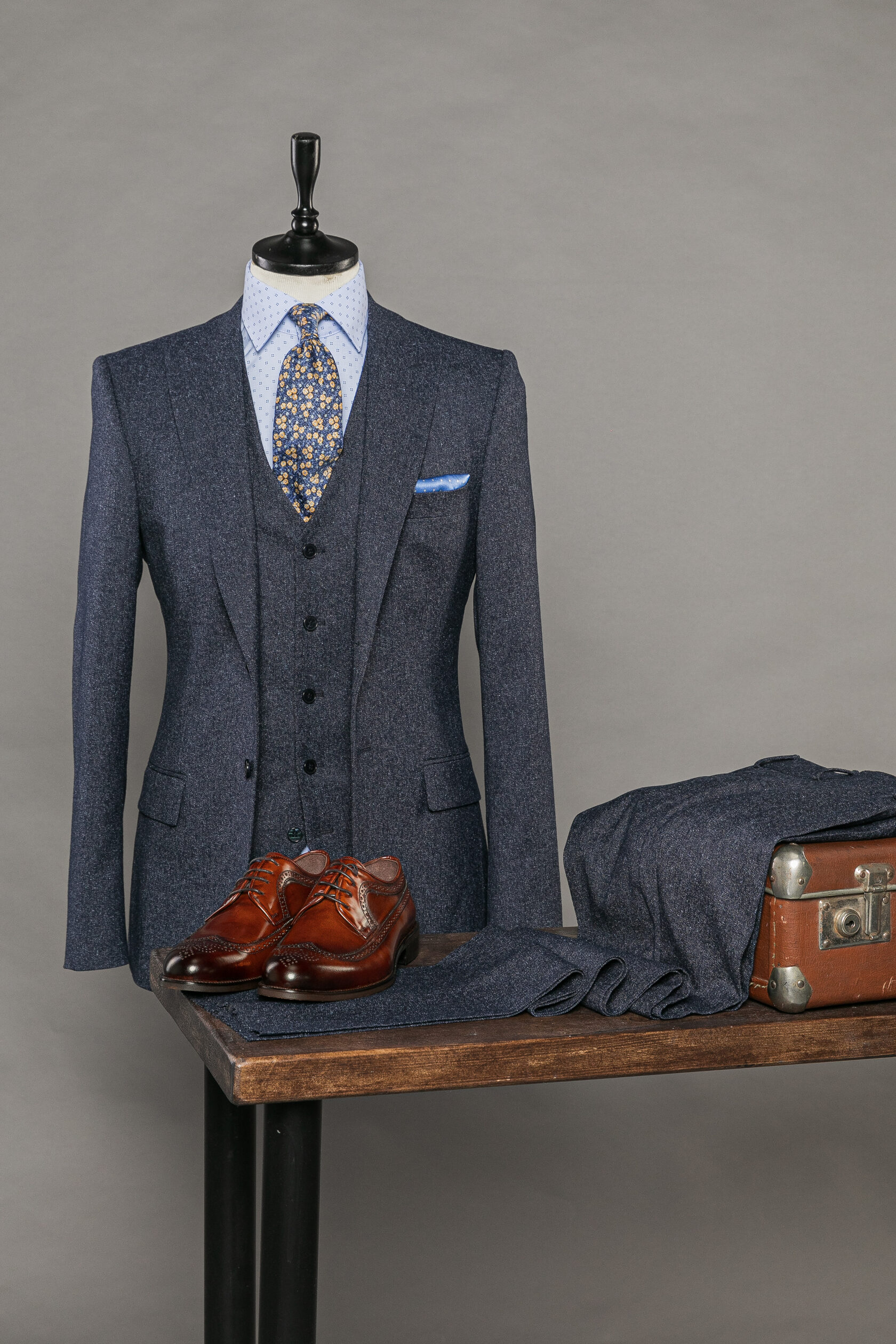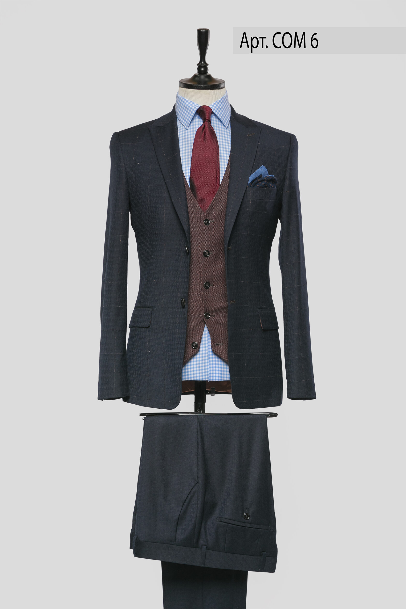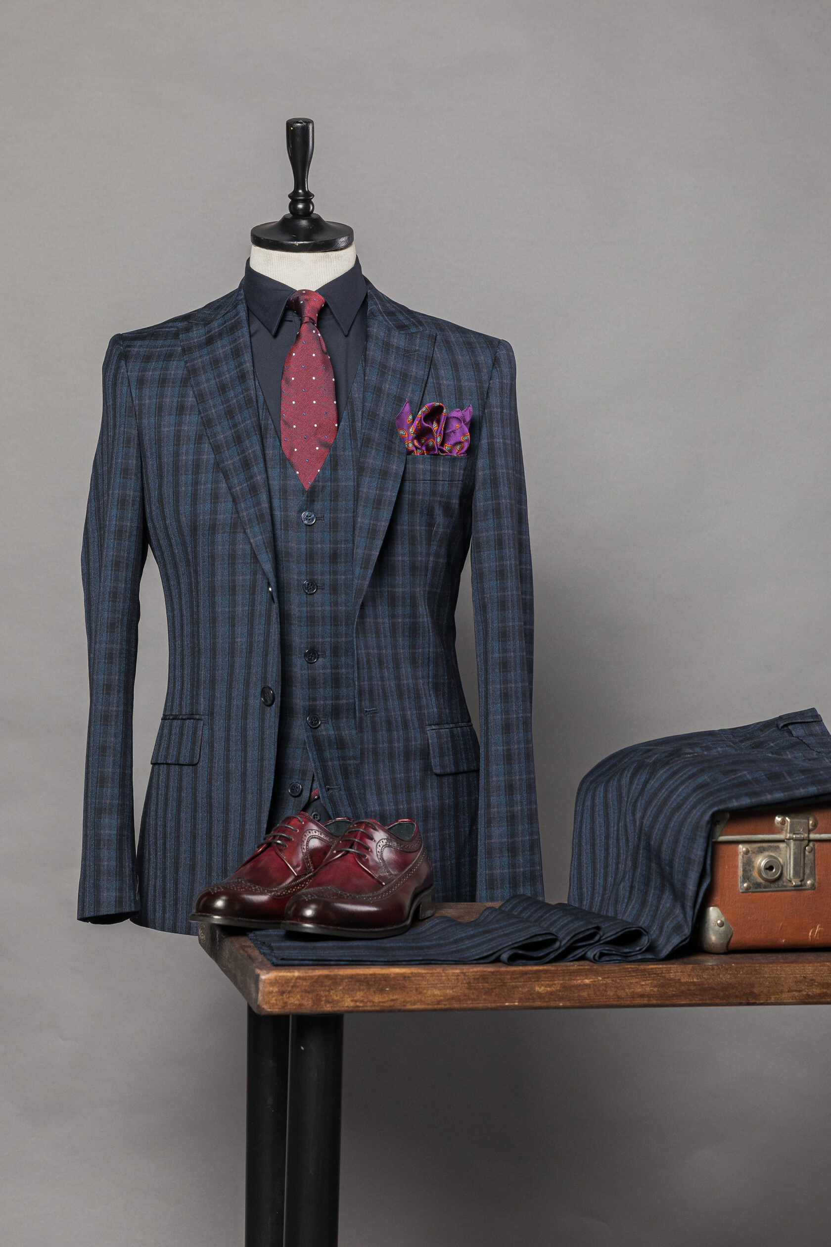 Стильный мужской костюм тройка имеет лацкан стиля «Ласточкино крыло» в сочетании с классической однорядной жилеткой.
