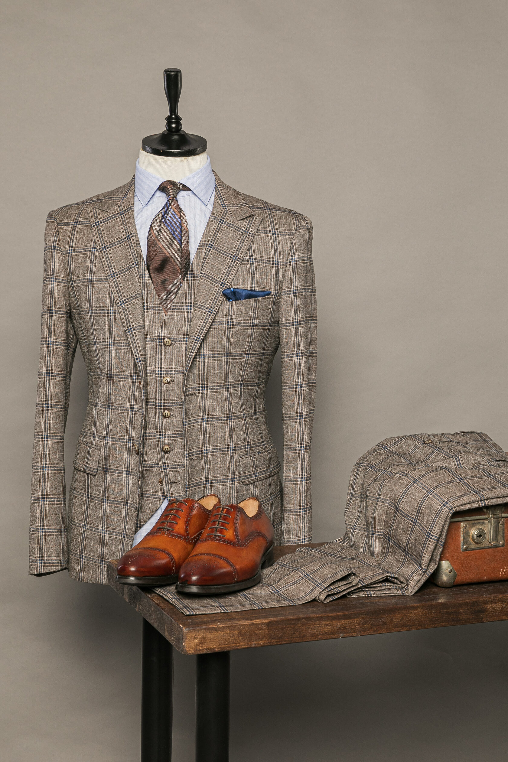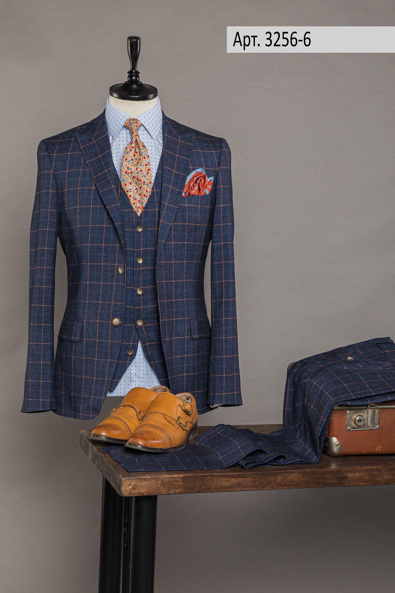 Мужской костюм тройка светло-бежевого цвета в крупную клетку синего цвета.