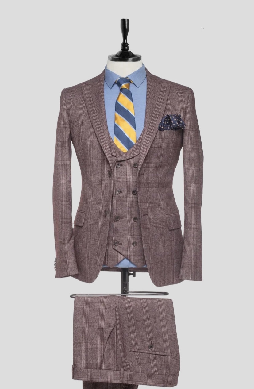 Мужской костюм тройка необычного пудрового оттенка в виндзорскую клетку. Крупный рапорт клетки и цвет основного материала делает костюм невероятно стильным.