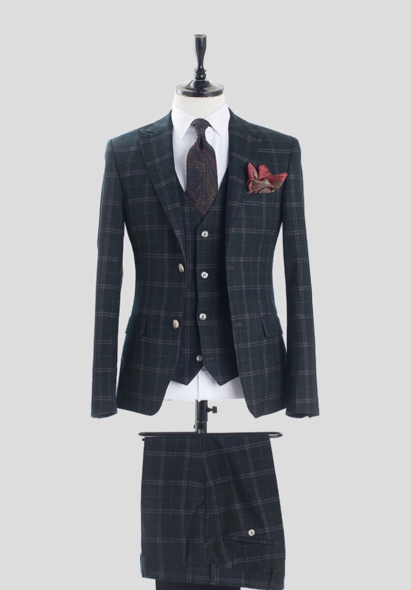Мужской костюм тройка темно-изумрудного цвета в крупную меловую клетку.