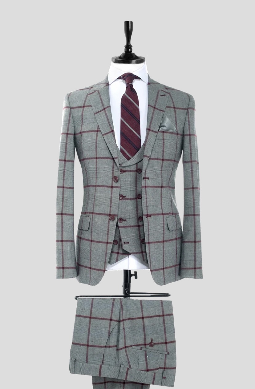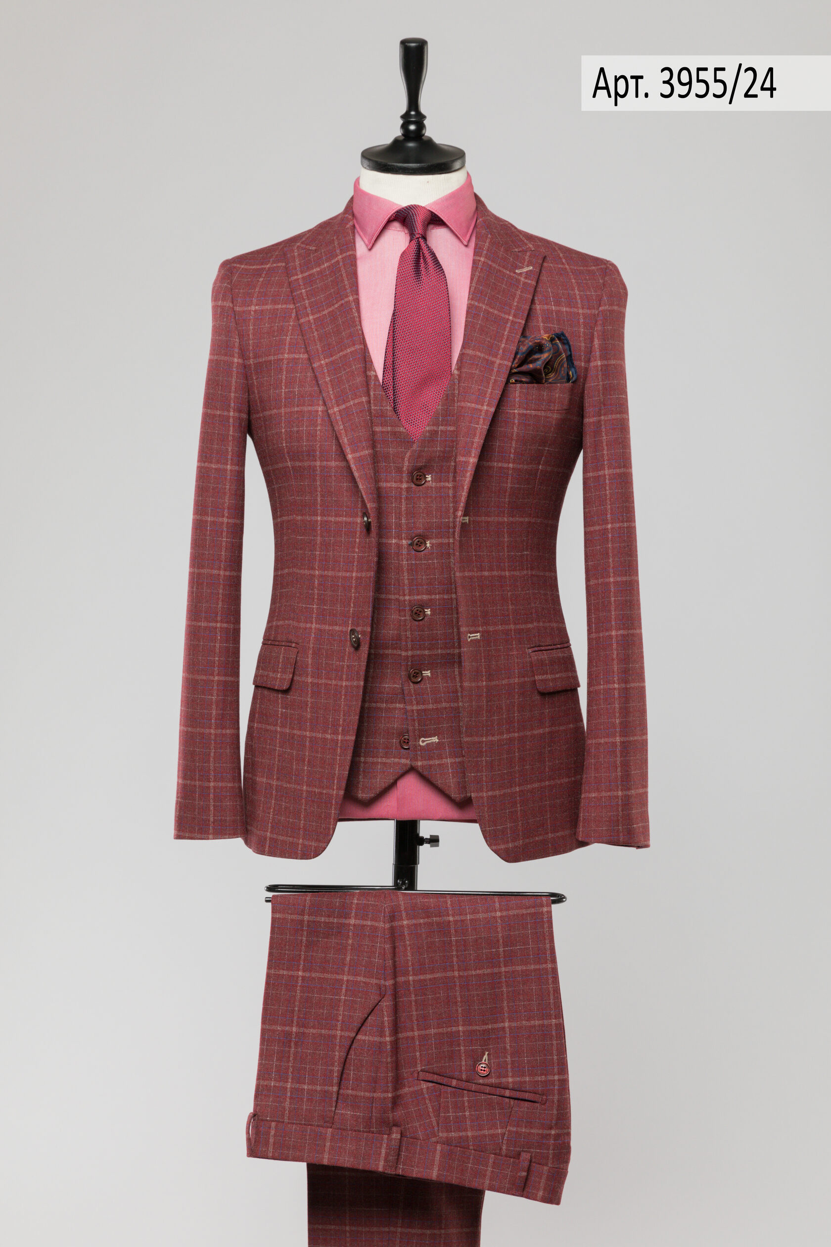 Мужской костюм тройка серого цвета в крупный рапорт бордовой клетки. Невероятно яркая и смелая модель.