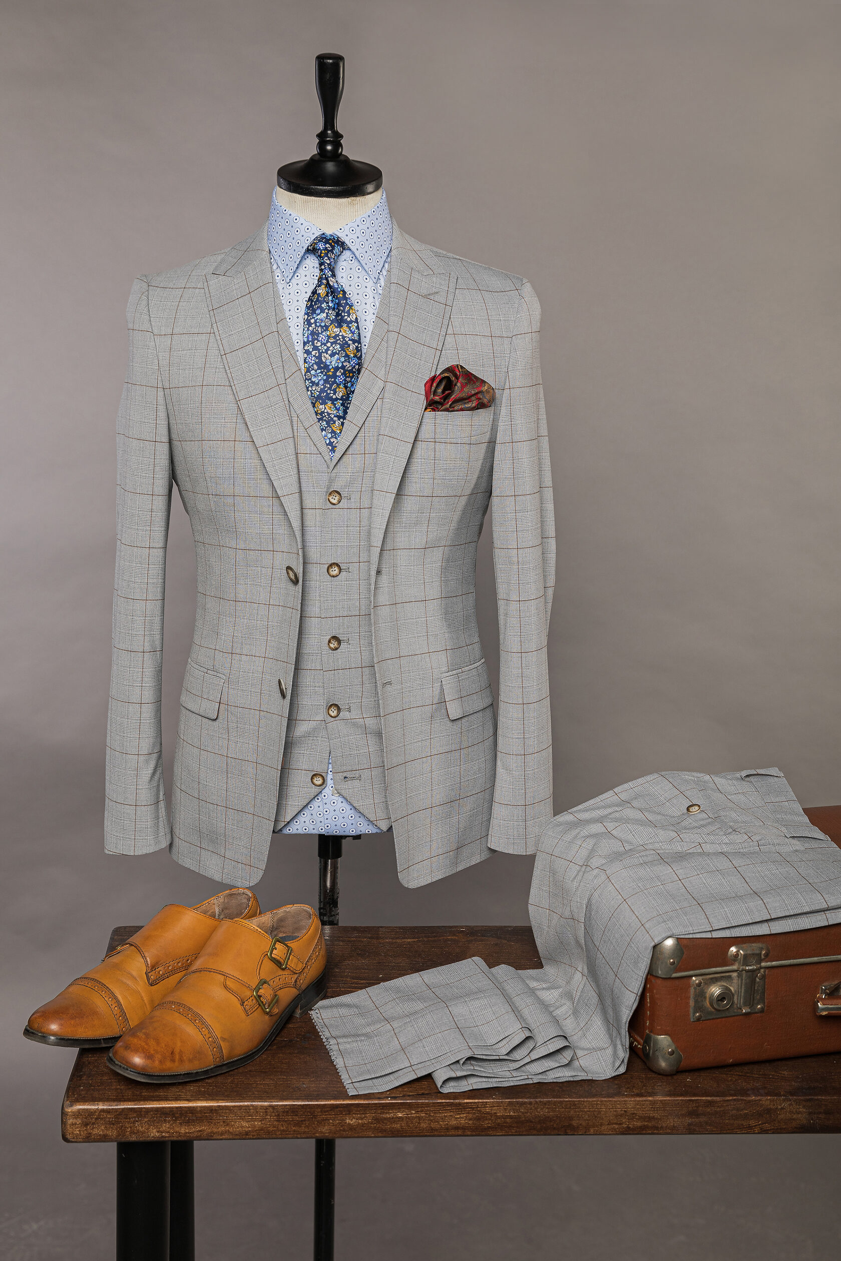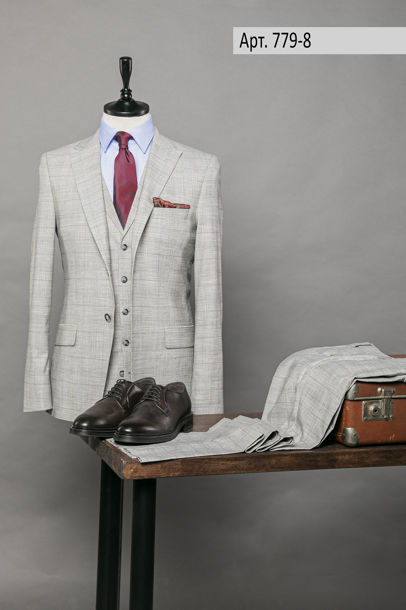Мужской костюм тройка светло-серого цвета в виндзорскую клетку цвета айвори.