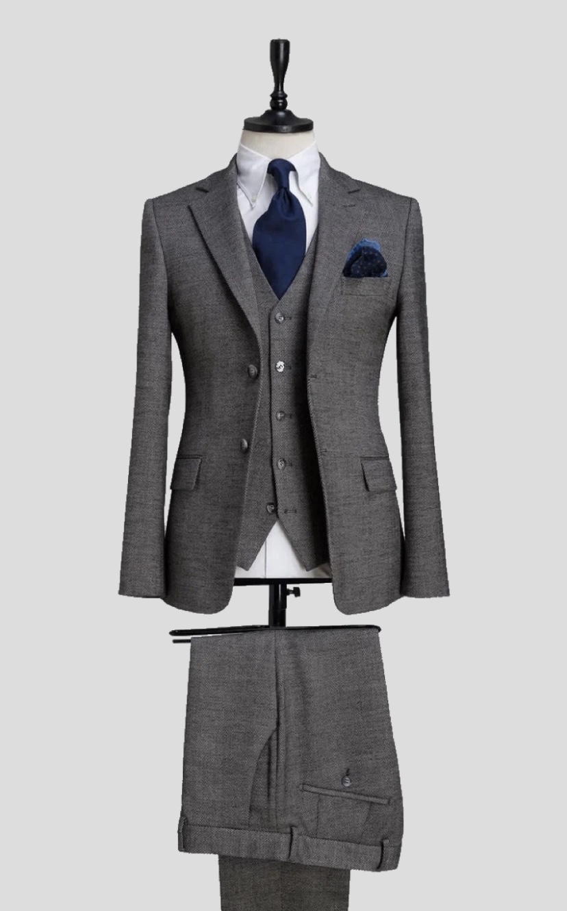 Мужской костюм тройка серого цвета, выполненная в фактуру «елочка»