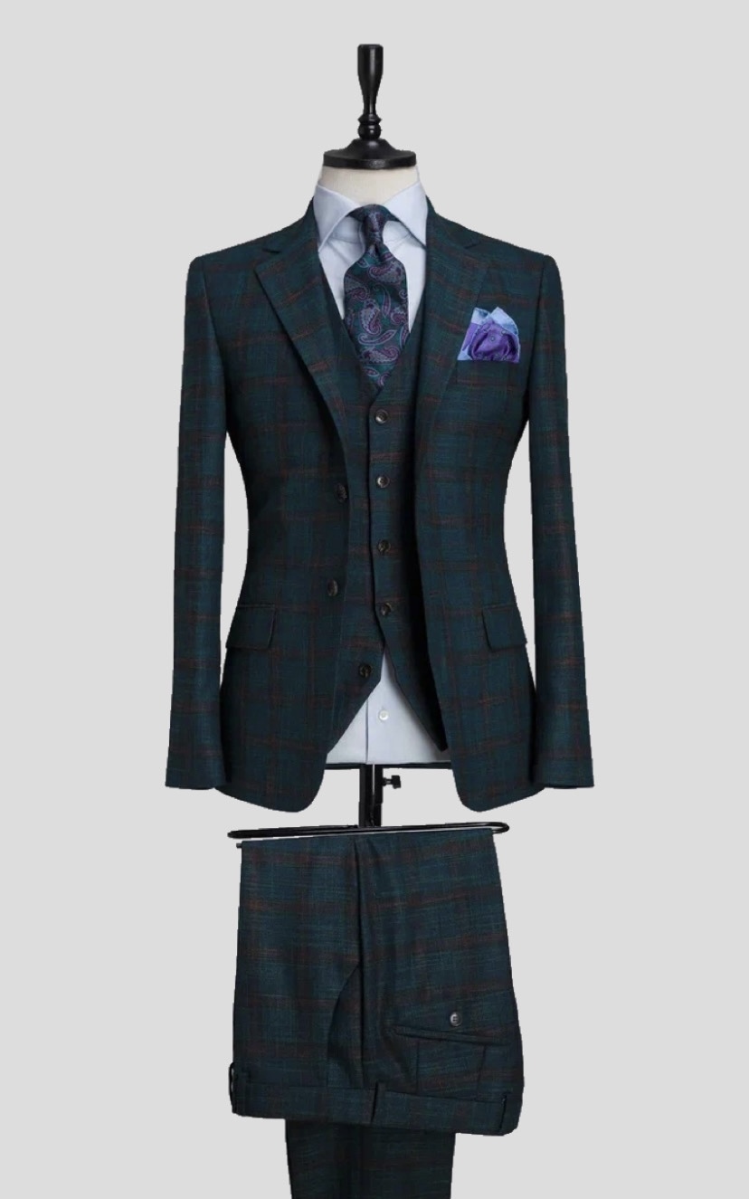 Мужской костюм тройка темно-изумрудного цвета в крупную терракотовую клетку.