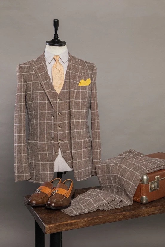 Мужской костюм тройка пшеничного цвета в клетку. Идеально подходит под свадьбы в стиле Бохо, Рустик, Лофт.